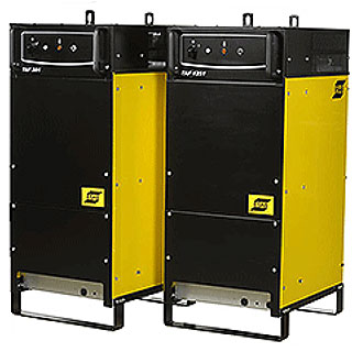 Источники серии TAF через тирристорный управляемый мост преобразуют вторничное синусоидальное напряжение с трансформатора в сигнал прямоугольной формы обеспечивающий хороший поджиг дуги и сварочные характеристики. Для увеличения производительности сварки компания ESAB предлагает использовать Тандем головы или мультипроволочные системы, в которых применяются источники переменного сварочного тока серии TAF.